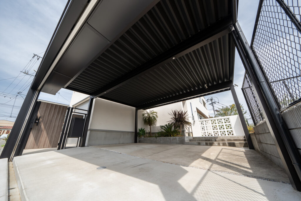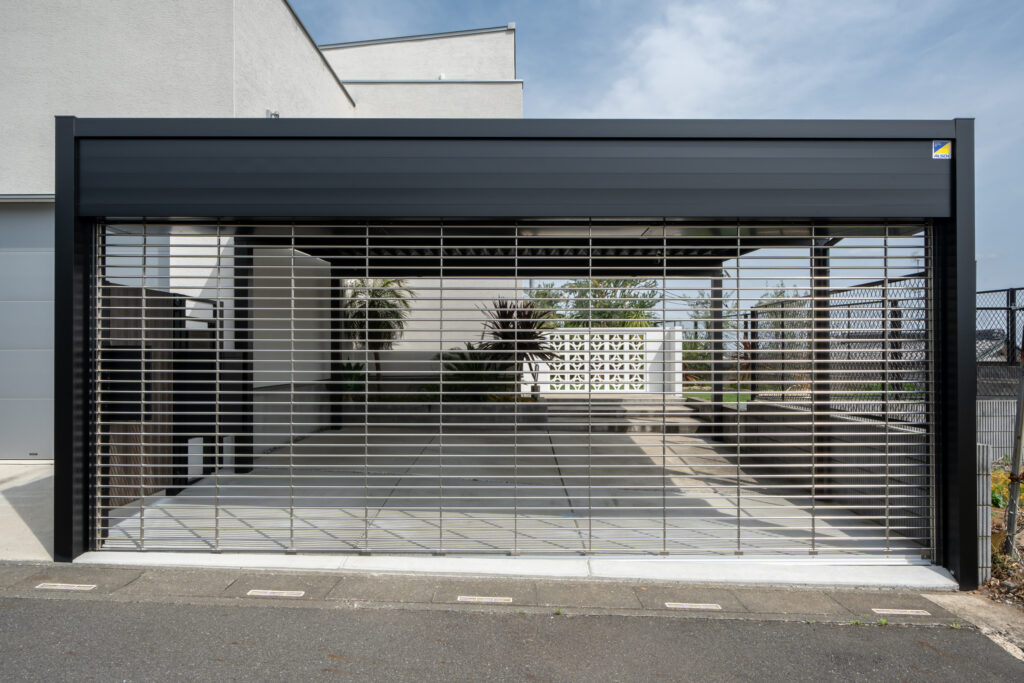 しっかりとしたセキュリティを保ちながらも閉塞感を出さないよう、シャッターゲートとデザインウォールをバランス良く配置しました。