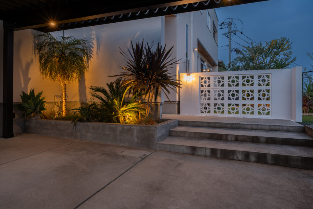 「雰囲気づくりにはこだわりたい、でも防犯性も高めたい」というお施主様のご要望にお応えし、安心と癒しが共存するリゾートスタイルのファサードをデザインしました☺️