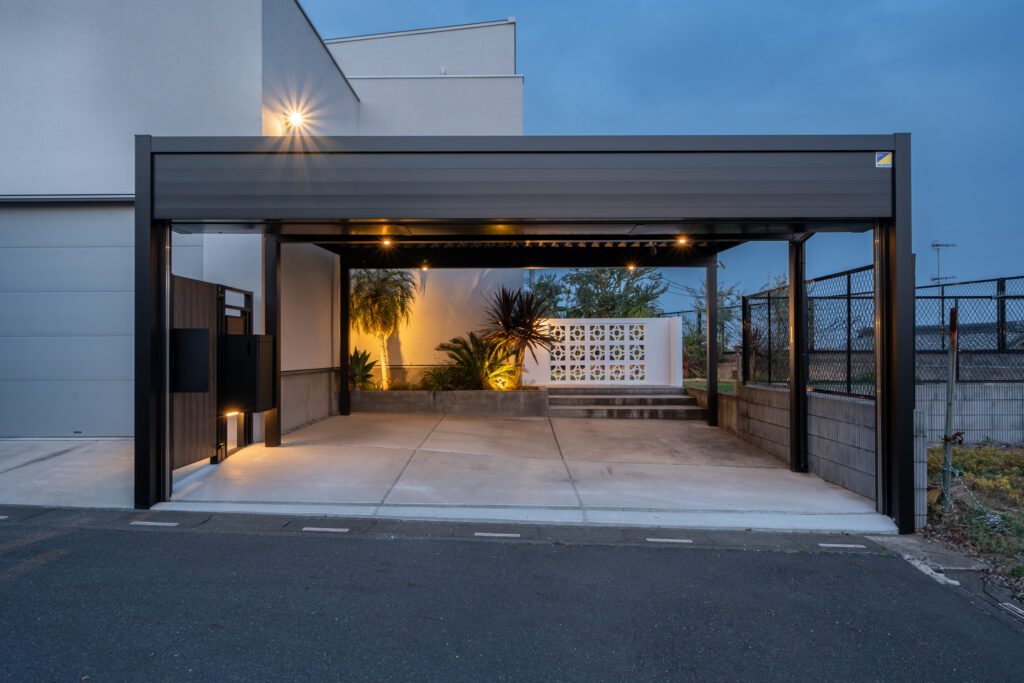 門柱やウォールに当たる柔らかな灯りが、夜のファサードに立体感を与え、昼間とは異なる印象を演出します。