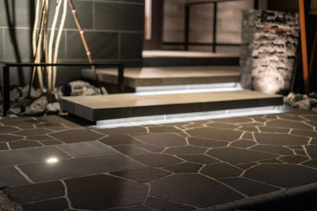 一段ごとに陰影が生まれ、アプローチ全体が“光のグラデーション”でつながっていくような印象に。