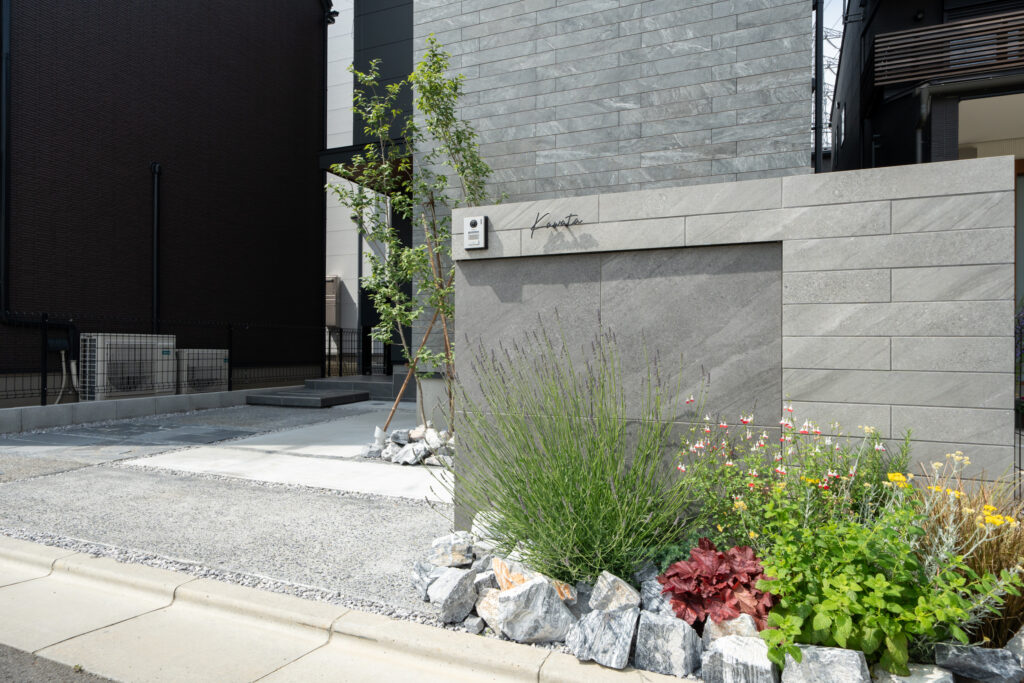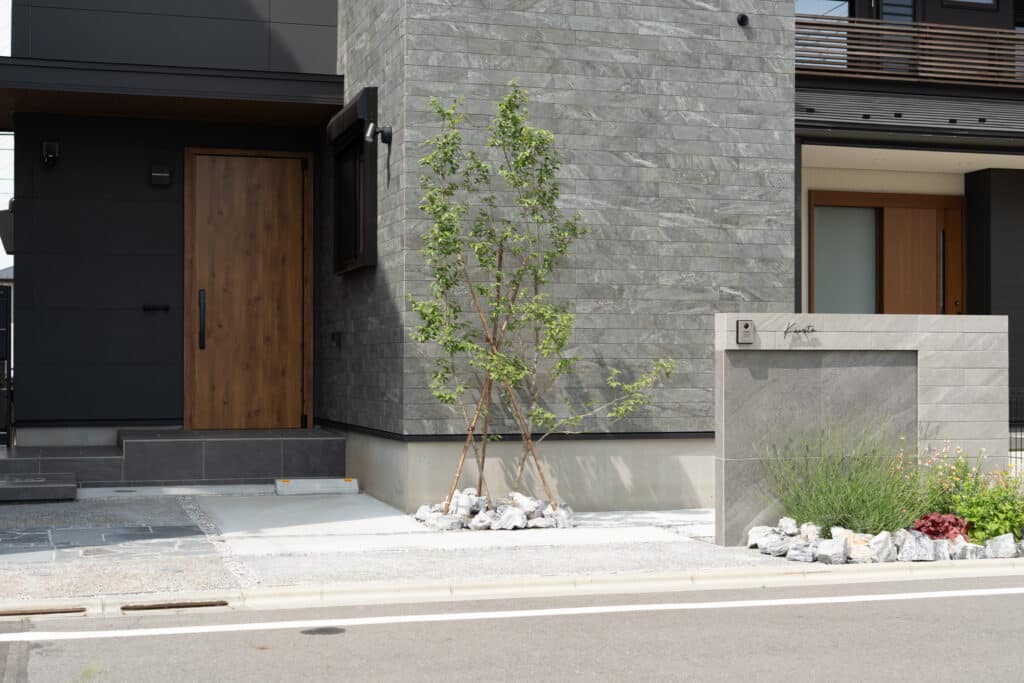 無機質になりがちなグレーの外構に、やわらかさと温かみをプラスしています。