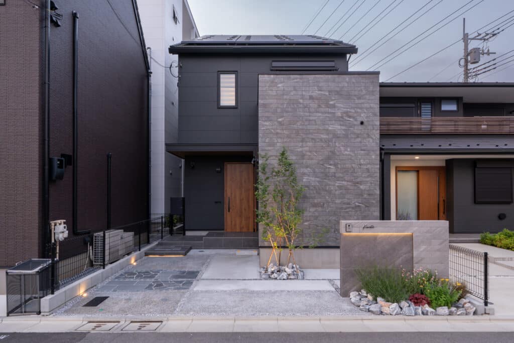 門柱や床材、外壁とのバランスを丁寧に整え、統一感のあるファサードに仕上げています。