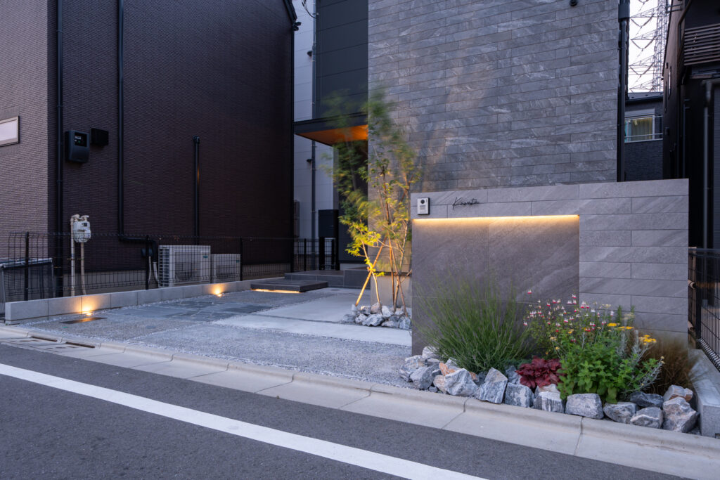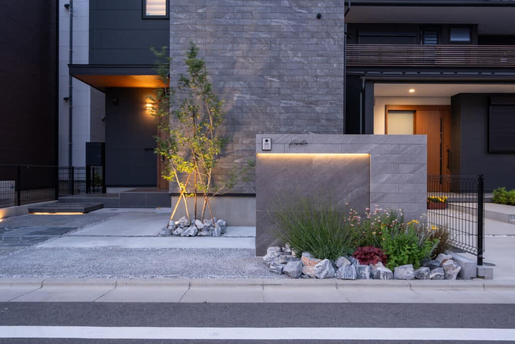 光の当たり方や時間帯によって変化する表情も、この外構の魅力のひとつです。